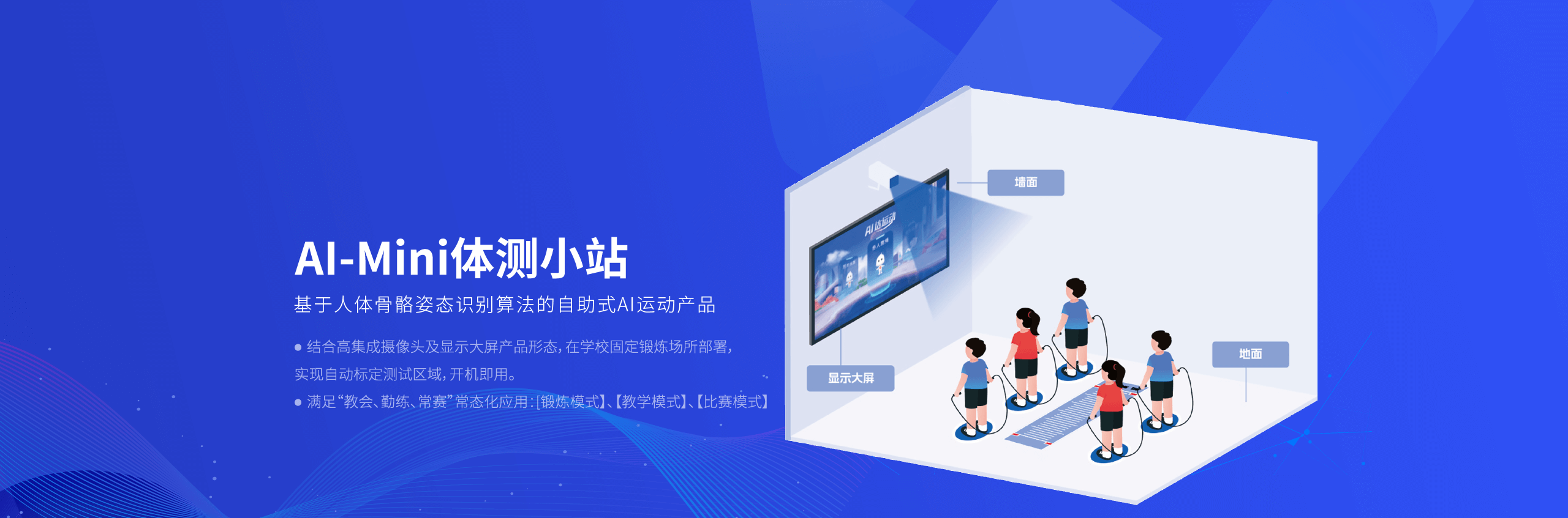 Al-Mini运动小站是一款基于人体骨骼姿态识别算法的自助式AI运动产品。